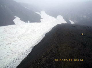 08;14 十勝岳北面の雪渓 スリバチ火口縁を過ぎ1760m付近の火山礫帯に来ると夕暮れのように暗く、風雨と砂礫に足を取られる前進だった。十勝岳北面の雪渓が大きく見えた。この辺りは新旧種々の火口が重なり複雑な地形をして興味深いが背を低くして突進するのみだった。 |