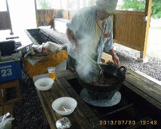| 12;43-3羆肉料理、ライダー館屈足 河西 旧ロッジアルプで濡れた靴や靴下の水分とりをやっていると河西さんが迎えに来た。トムラウシ山へ登る日程を1日に延ばすことにして、天気待ちに「ライダー館くったり」を紹介された。ライダー館は屈足公園内にあってオートバイ等の旅行者が泊れる無料施設だが、トイレ、水道、電気までありスマホの充電が出来て大助かりだった。昼食はBBQ棟で河西さんが本格的なガスコンロと専用鉄鍋をセットし、羆の生肉スライス、味付き鹿肉ジンギスカンと野菜などを料理してくださり、おにぎりや漬物などとともに美味しく腹いっぱい御馳走になるとともに差入れまで頂いた。 |