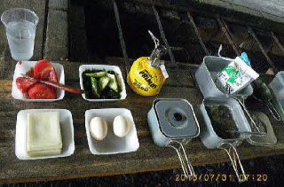 07;20朝食ライダー館くったりBBQ場 ライダー館で、差入れの大きなトマト、卵、野菜で朝食と昼食を済ませた。午後、河西さんが迎えにきた。途中、トムラ登山学校へ寄り、トレーニング用人工壁(クライミングウオール)を見学した。冬季は水をかけて氷壁とするそうだ。国民宿舎東大雪荘へ向かった。東大雪荘は人里離れた奥地にある割りには立派な建物だった。トムラウシ野営場にも寄ったが草が生え周囲に羆が居そうな雰囲気だった。トムラウシ短縮登山口への道のりはまだ長く雨の夕暮れだった。 |