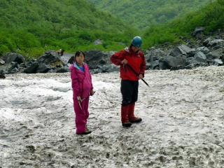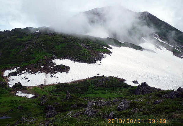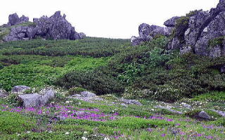 | 05j47新冠コース渡渉点から幌尻岳 渡渉点には仮橋が掛けられていた(5:50)。のっけからの急登。見晴らしの効かない尾根の直登を続け唯一の「見晴台」(7:49)。同宿の6人パーティが追いつき鐘・鈴・呼子を吹き鳴らしていった。新冠コース中間点(8:17)。水場を渡る(9:05)。霧で見通し効かず。お花畑(9:39)は時期が早いようだ。羆の糞や地面を引っ掻いた痕があった。狩野OBと別れ先行した。稜線に至ると振内コース分岐だった。周りの山は雲の中。 |
