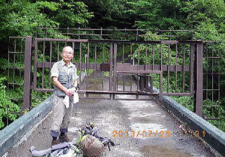 | 7.26 11;31 いこい橋ゲート 入林許可の記入をし、ゲートをくぐって食料5日分のザックを背負い10:50出発した。林道19kmは羆の生息地である。いこい橋は橋上の堅固な回転扉を身一つでくぐった。林道は緩い登降を繰返しながら徐々に登り延々と蒸し暑い。大理石沢、雷沢、原石沢、末広沢などを越える。 |
