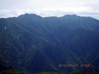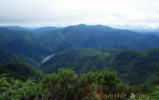 | 12j36 幌尻岳南方イドンナップ岳と幌尻湖 日高主脈は雲が掛っていた。前方左のナメワッカ岳と右のイドンナップ岳の鞍部の向こうにシカシナイ山などを望み日高の山深さを味わった。水場(1700m)から原始林の尾根をひたすら下って渡渉点に至り、汗ばんだ身体とシャツを洗った。山荘に着く(16:30)と週末で登山者が増えていた。 |