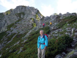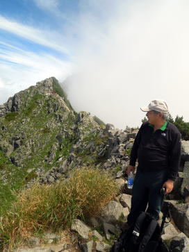 | もう既に独標のピークには人が見えます。写真は高校時代の岳友で、元山岳同志会に在籍していました。私と違って体重が30㎏近くも軽く,岩場を軽快に歩きます。 | 独標です。ここまで1時間です。いつもはケーブルの下から日帰りでここまで来ますが、昨晩は小屋泊まりのため楽です。 | 小屋から西穂まで大小11のピークを越えます。目の前に大きなピラミッドピークが聳えており、西穂は3つ目の大きなピークです。 |