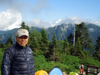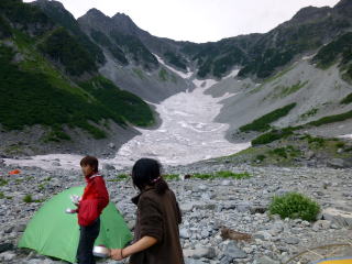 | ようやく涸沢に到着しました。学生たちは我々の到着を今か今かと待ち構えていました。山で再会するのは何故か楽しいものです。昔の集中登山の楽しい思い出が蘇ります。 | 学生たちは無事キレットも越へ、山川君は穂高山荘まで足を伸ばしたことも知りました。重荷での岩稜縦走も含めて、縦走に関してはもう実力十分です。 | 現役学生のテントの横に、故納見OB寄贈のメスナーの冬天を設営します。 |
