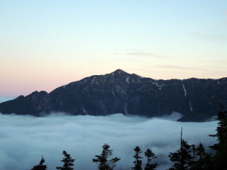 | 長い梅雨の戻りで連日雨が続き、ようやく晴れの予報が出て、来てみたら、西穂山荘までの登りは雨の中でした。でも涼しくてかえって良かったです。 | 朝、起きて外を見たら晴天で美しい雲海が広がっています。左は霞沢岳、上は笠ヶ岳です。 | 5時半に出発し丸山に登ります。彼方に今日の行程の独標、ピラミッドピーク、西穂高が望まれます。 |