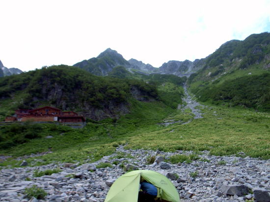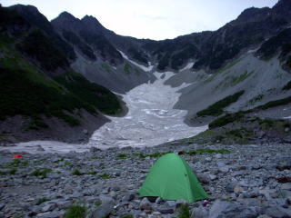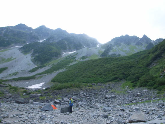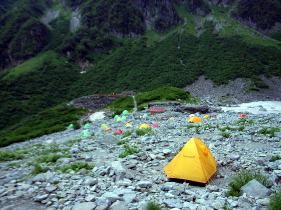 | 台風接近のためか、夏の終わりの涸沢は寂しい光景です。薄いグリーンのテントは涸沢ヒュッテの宿泊用テントで、泊まっているわけでなく、それを除くととても少ないです。 | ||