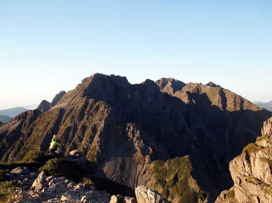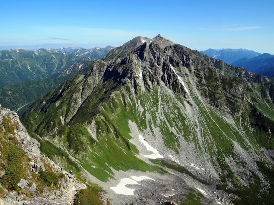 | 西穂高のピークにて。間ノ岳の彼方にジャンの飛騨尾根を従えた奥穂が鎮座している。 | ||