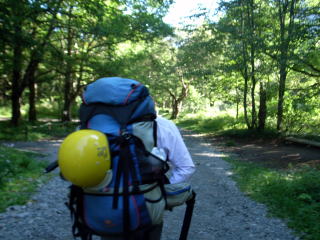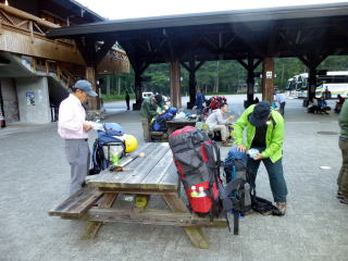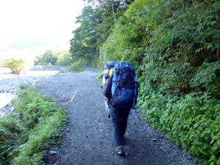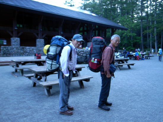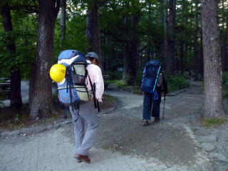 | 早朝涸沢に着き、朝飯を済ませてパッキングします。ザックが満杯なので無理やり押し込みます。 | いざ涸沢に向け出発です。上高地に夜行バスで来るのも久しぶりです。 | ずっしりと荷が肩に食い込みます。 |