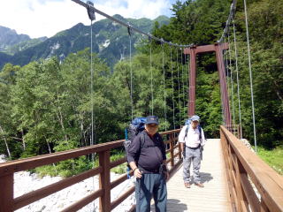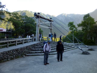 | 本日は台風前の晴天です。学生たちはキレット越えの日のため良かったと想います。 河童橋ですが先の事を考えると景色は楽しめません。 |