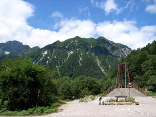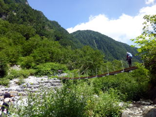 | 横尾からの道は長い時間をかけて整備され、歩きやすくなりました。昔は直ぐ冠水しましたが、それも少なくなったのでしょう。 | 屏風にも目もくれずひたすら本谷橋を目指します。 | 本谷橋です。今は立派な吊り橋で、5月までは雪のためこの吊り橋を外しています。下りは昔通り丸木橋を渡ります。 |