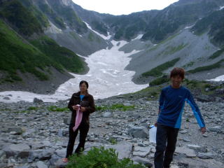 8日上高地で仮泊し、通い慣れた明神、徳沢、横尾と左手に穂高連峰を望みながらの何時もの横尾街道は楽しい時間です。連休も過ぎているせいか、これから登る人、下山する人で何時もは賑やかな横尾山荘前は数人の登山者しか見当たらず静かです。ここからは残雪が所々現われ始めてきます。ワサビ沢を横切り、一ノ俣の橋を渡り、樹林帯を行き、二ノ俣の橋を渡ると槍沢ロッジも近いです。 |