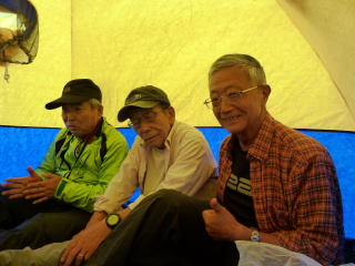 | 天幕内で持参の果物やお菓子を食べお茶を飲みながら、縦走中の話を聞き歓談します。 | 学生諸君は年寄りの話にも、良く耳を傾けてくれます。自分の息子や娘が学生の時、同じように耳を傾けてくれていたでしょうか。 | まだ稜線は見えますが怪しい天気になって来ました。 |