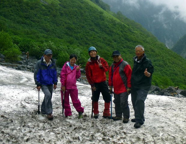 翌日も朝方から天候が回復せず、濃霧で霙交じりの中を下り出す。50m~100mピッチの赤旗を頼りに、ぐすぐすの雪の斜面を下る。赤旗を外さない様に気を付けながら下る内に標高がさがると、視界も良くなり気楽に下れる。途中でアイゼンも脱いだ。雨の中槍沢ロッジを通過し、横尾山荘で一服。その後はひたすら上高地を目指した。雪と雨にたたられた山行だったが、何時もながら、日本酒、てんぷらと蕎麦は忘れませんでした。 |