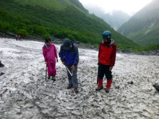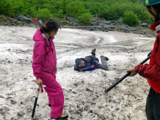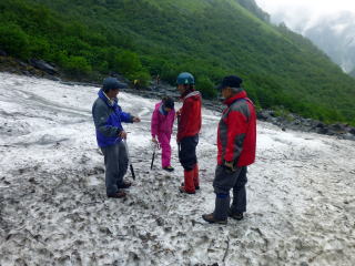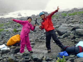 | 下山前に雨の中ですので、計画した雪上訓練を簡単に行いました。 | 本来はザイテン下の傾斜のある雪渓で、実際に滑って行うのですが、雨天のためヒュッテ下の雪渓で形だけ行います。 | 井村OBが滑落停止姿勢の見本を示します。 |