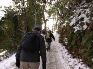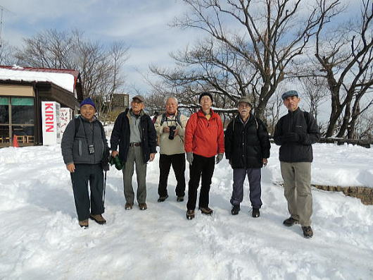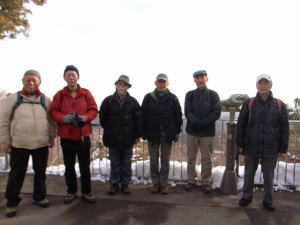 年も明けた1月、寒い日々が続いていましたが、41年同期は高尾山に行きました。 当日高尾山駅に集合すると、皆の靴はトレキッグシューズやスニーカーなどマチマチで、薬王院までだとか、ピークまで行くつもりだとか、それぞれ自分に都合の良いプランを勝手に描いており、靴も自己のプランに合わせて履いてきていました。登山が目的でないので当然ケーブルカーは往復券を購入しました。 薬王院に着くと、高尾山麓に住まいを移し高尾山の千日回峰を行っている秋野OBのピークへの近道があるとの話で後について行くと知らない間に雪のピークに着きました。高尾山も往復ケーブルを使用すると、新宿界隈をうろうろするより楽なことが判りました。 |