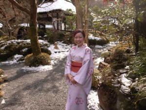 | ピークです。週末に備えて茶店の人たちが雪かきをしています。 | 下山して予約してあった「うかい鳥山」に来ました。着物美人が出迎えてくれます。 | 雪の庭を見ながら、熱燗と地鶏料理を楽しみました。 |