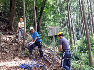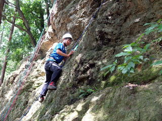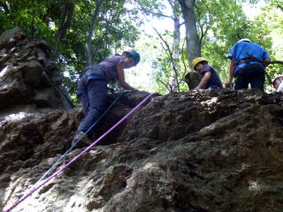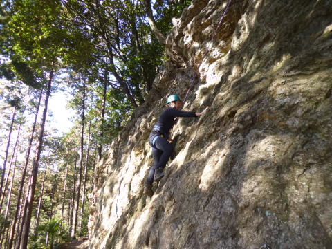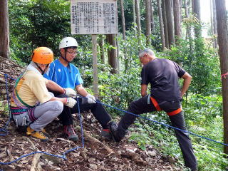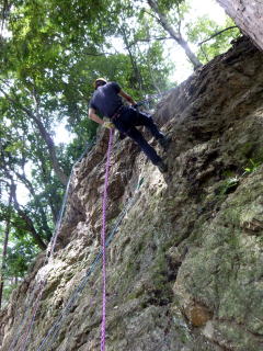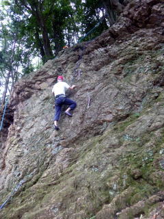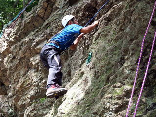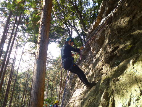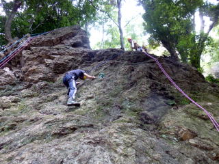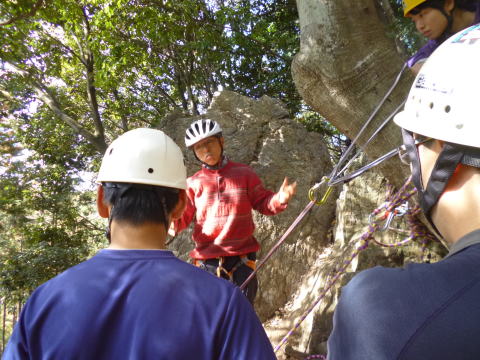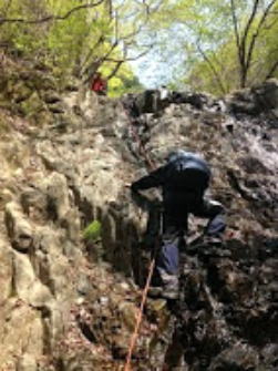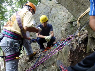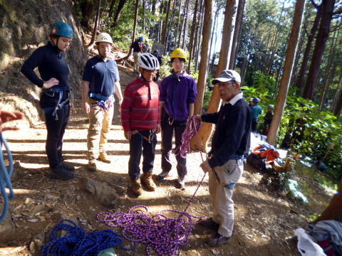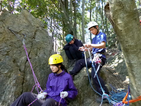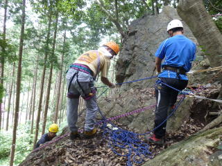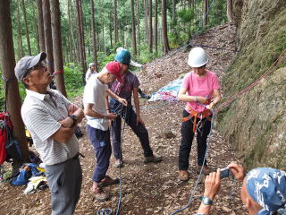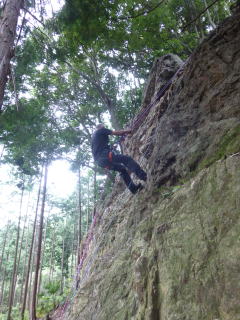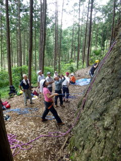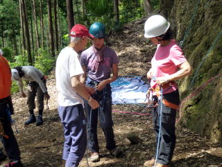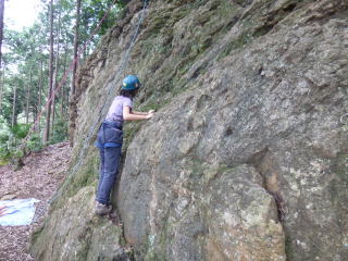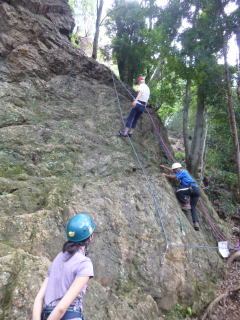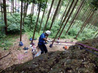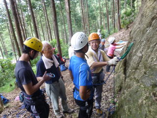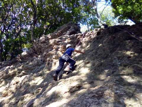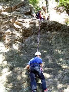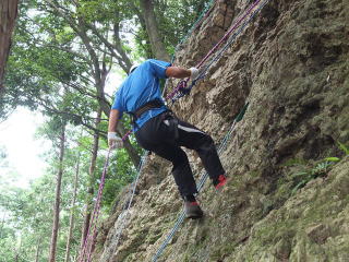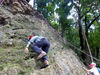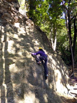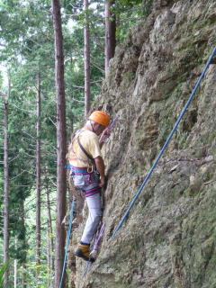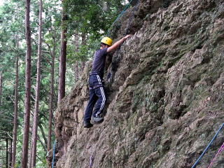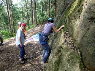 | 最初、 八の字結び 万が一に備えてのブーリン結び など 初歩的なザイルの扱い方練習。 三点支持の基本動作。 ザイル無しで高さ2〜3mの上り 下りを行う。 | |