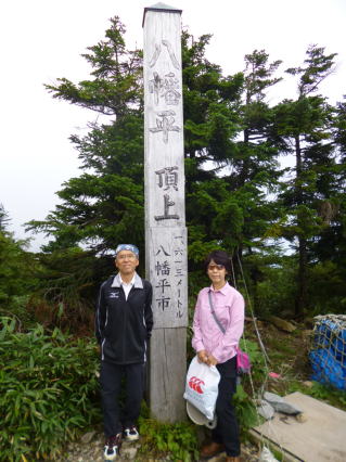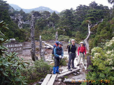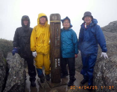 宮之浦岳頂上 一帯は風を防ぐ樹木無く冷雨が叩きつけた。ダウンジャケットに雨を重く吸わせながらザックをルーズに背負い佇んでいる若者がいた。聞くと雨具は持っているというので着用と背負ベルトの締めを勧めた。世界遺産に登録されてからなのか登山らしくない者が上ってくる。…風に伏し視界が得られぬまま進み、主目的地の宮之浦岳(1935m)に着いた。さすがに寒い。記念撮影のみで下山にかかった。 |