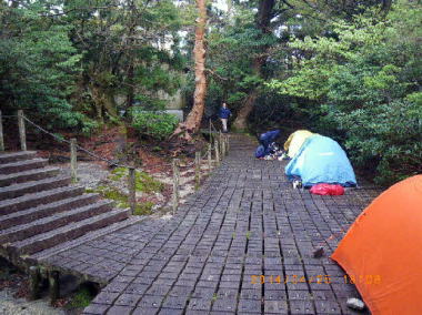 新高塚小屋前 風と雨の当たる尾根の上下を繰り返しながらしながら下り、樹林帯に入ってさらに下り日暮れ前に漸く新高塚小屋(1460m)に着いた。小屋は樹木に隠れて直前まで分らなかった。小屋の手前に木製床が拡がりテントが数張り張られていた。小屋中には濡れ物が処せましと掛けてあった。食料も鼠対策に吊るした。 |