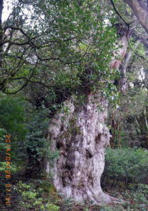 | 夫婦杉 めおとスギは3mほど離れた2本の巨木の枝が高さ10mほどでつながっている。右(夫)の周囲は10.9m。 |