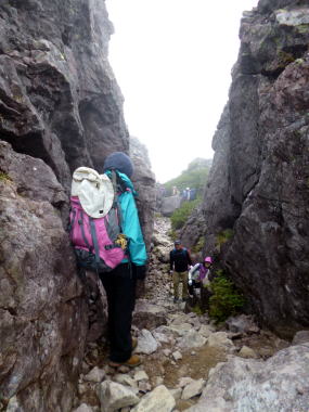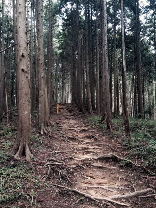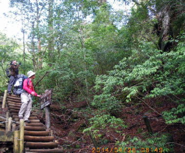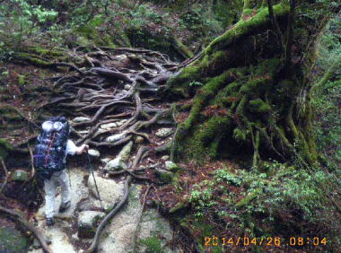 辺りは鬱蒼として、巨木の根が雨に洗い出され、浮き上がった網目状の上にルートが取られ、根を踏みながら歩くのを遠慮したい気持ちになった。大きなタンク二つ(40L)を背負子で担いで行く人が次々と通る。小屋のトイレから糞尿を担ぎ降ろしているのだった。お蔭で快適な山旅ができて環境が護られていることに大きな感謝の念を新たにした。 |