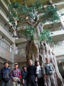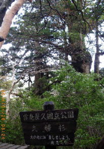 屋久島イワサキHロビー ホテルのロビーの高い吹き抜けには、巨大な屋久杉が飾られていた。廣瀬夫人と山根夫人は戻ってくるので荷物を預けた。6人を乗せたレンタカーは安房分岐まで戻り山道に入った。屋久島の海からそそり立つ地形を感じながらぐんぐん高度を上げると植生が変わり、猿が道を塞ぐようになってきた。尾立峠で荒川への道を分け、ヤクスギランドに至ると数台の車と人影があった。そこから緩い勾配を登り、紀元杉、川上杉などを車中から眺め通過した。 |
