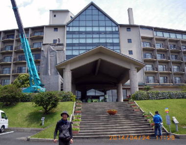 | 屋久島イワサキH前 いわさきホテルは、アプローチの植え込みからゆったりとして豪華だった。山口夫人は所要で不在のため会えなかった。 |