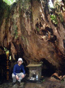 | ウイルソン株内部 300年前に伐採された切り株だそうだが、胸高周囲13.8mは太く、中は空洞になっていて、中に入るとお社が祀られ、川が流れていた。 |