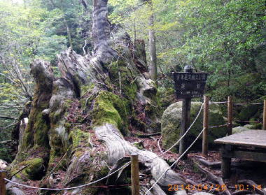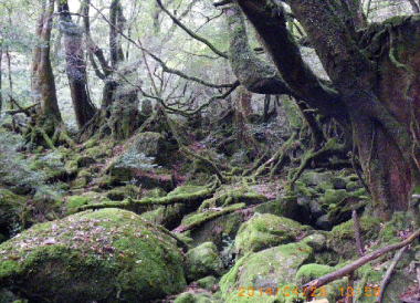 苔の森 ジブリのもののけ姫の舞台になったのはこの辺りか?巨木の朽ちた上に二代目〜三代目が育ち、曲枝が交差し、それらが1000年の歳月を掛けて絡まりつつ鬱蒼と苔生していた。 |