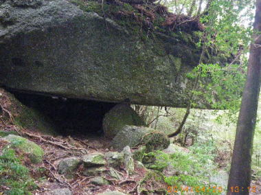 | 辻の岩屋 楠川分れは見落としそうな場所だった。軌道を離れ辻峠(979m)へ緩いが長い登りとなった。外国人ともすれ違った。峠の手前に巨岩があり、雨を避ける岩屋になっていた。峠直前の水場は水量豊富で美味しかった。 |