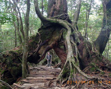 | くぐり杉 屋久島の樹木は、多雨に土壌が流されるためか、花崗岩質に根を深く張れないためか、根が浮き出している。くぐり杉へ来たら根の下の洞の向こうにいる外国人の青年と目が合った。 |