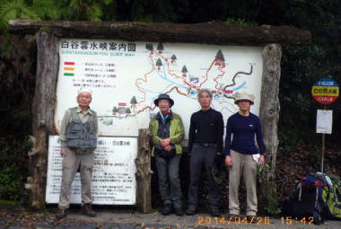 | 昨年の秋、丹沢キャンプの時に山川(幹事長)と井村でモミソ沢を登り、山川はまた行きましょうと興味を持った。4月に何処かないかなと、人気のある葛葉川本谷を選び、角田と今年入った松田と真藤が参加して、5名で4月27日に遡行しました。 天候も良く、良い沢登り日和となった葛葉の入渓地で登攀準備を整えます。人気のある沢なので、あちこちで準備をするパーティーで賑やかです。 しばらく小滝を越えてゆくとF1で、その後F2は正面の乾いた岩を登り、F3は左側を登る。F4はV字状の2段で左側のルンゼを登り、水流の多い滝をトラバースして、直上する。ザイルを出して井村が登り、皆メンバーは濡れながら登ってきた。今年入った2名も段々沢に馴れて、安定感が出てきます。間もなくF7 と林道が見えてくる。途中でも練習の為にザイルを出したりしたので、大分時間が掛かってしまう。F9のチョックストンの滝を超えると、F10富士形の滝が見えてきます。先行パーティーがいたので、大分待たされた。この滝は2段10mの滝で、まずは滝の左側のフェースを登り、右にトラバースして、クラックを直上する。ここもザイルを出して訓練した。ここまで山川と井村がトップを交代してきた。 これで核心部はほぼ終わりで、詰めに向かって崩れやすい沢筋を、落石に注意しながら、黙々と登る。4月の沢登りのシーズン初めのせいか、岩が安定していないので、途中から左の草付に入ったが、踏み跡が安定せずピッチが上がらず。暫くすると三ノ塔尾根に出た。三ノ塔ピークで健闘を称えて握手。三ノ塔尾根を下らず、ヤビツ峠経由で下山したので、大分時間が掛かってしまった。 秦野で完登を祝して、ビールで乾杯でした。