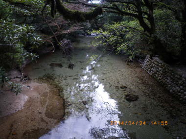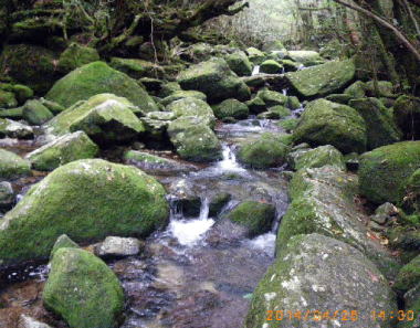 苔の沢 苔の森は、沢の岩も苔生して緑色をしている。大雨の流水でも土砂を含まないことにより苔が削られないのかと思った。湿気に霞む向こうをもののけ姫が白犬に跨って走って行ったようでもあった。 |