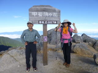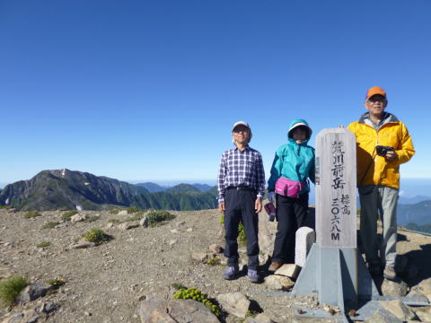 | 左から甲斐駒、仙丈、北岳、間ノ岳、農鳥岳、塩見岳、荒川三山です。 | 宝剣をバックに。 |
