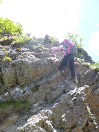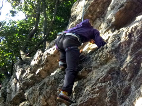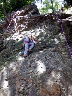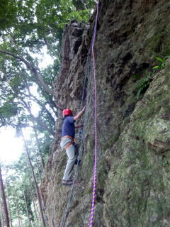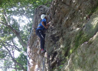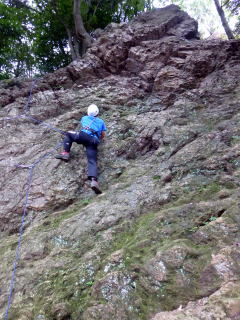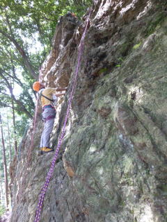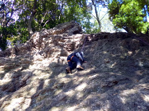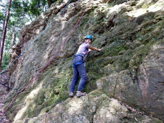| 岩に慣れたところでアンザイレンを行い、10数mの壁を登る。 | |
