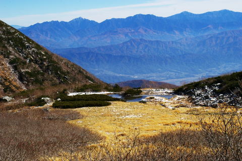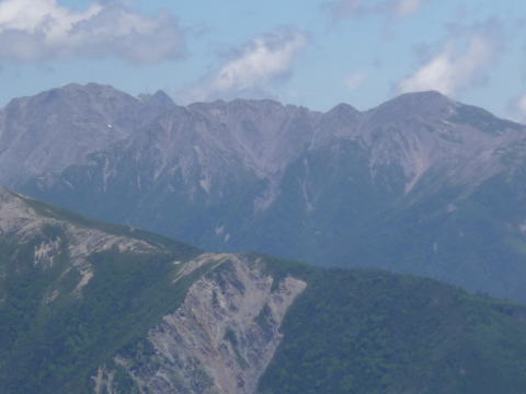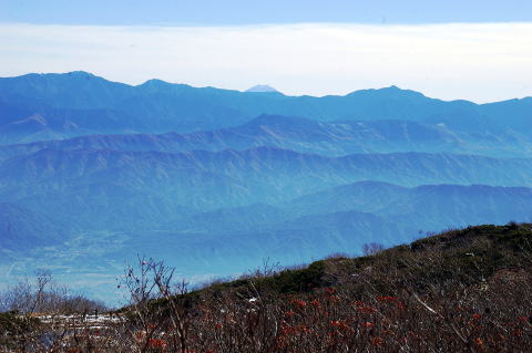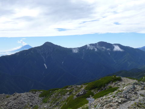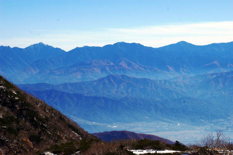 | 背後に南アルプスを望みます。左から甲斐駒、横に長く横たわっているのが仙丈で、右にある尖った端正な山容は北岳です。 | 左から間ノ岳、農鳥岳で、その右に富士が顔をだしています。右に行くと塩見が見えます。 |
