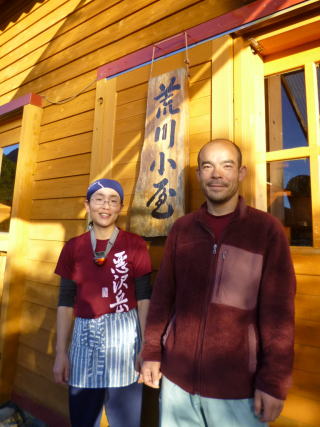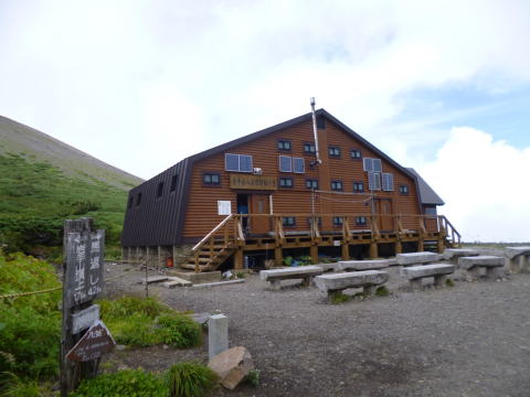 | 高塚小屋 高塚小屋(1330m)は計画より1時間半の遅れの通過となった。高塚小屋は昨年建て替えられて新しいが若干狭く水場もない。横のトイレ棟で数人が作業をしていた。 |