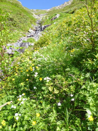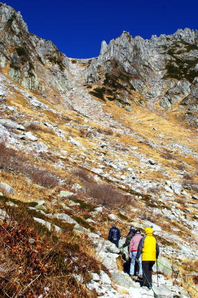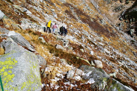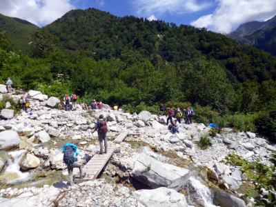 新穂高出発が遅かったせいか、蒲田川左俣林道では前後にパーティが殆どいなかった。小池新道に入ると間もなく数組の先行パーティを追い抜き、秩父沢からは家族連れや、数人から十人を超えるツアーのパーティなどで賑わう。
