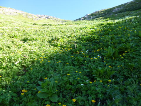 | この辺りから登山道はジグザクに着いていますが、雪の時は上のコル目がけて真っ直ぐに登ります。 先行した登山者の姿が点となって見えます。 | この上でカールのトレッキングコースは終わります。 |