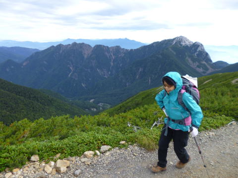 笠新道を下る。広々とした杓子平付近からは、今まで歩いてきた稜線や槍・穂高を見上げることになる。滝谷の上に穂高連峰、穴毛谷の上に笠ヶ岳が雄大、ゆっくりと休憩。この杓子平以外は傾斜が急な下りが続く。笠新道登山口に着いて一安心、水量豊富な水場で二回目の昼食。新穂高まで林道歩き。 |