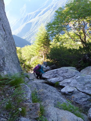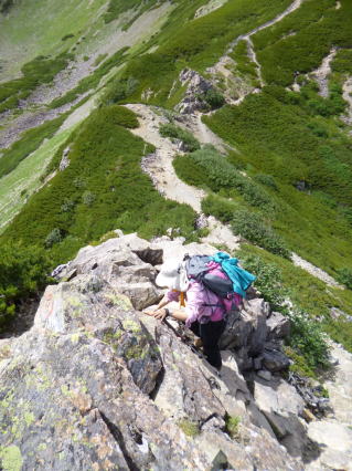 | 下を見て スタンスを確認しながら降ります。 | 西穂〜ジャンダルム〜奥穂の悪場でも、このピッチほどではありません。しかし高度感が違うのです。 | このクライムダウンが訓練の重要部分です。無雪期の稜線の岩場での事故はほとんどクライムダウン中に起きています。 |