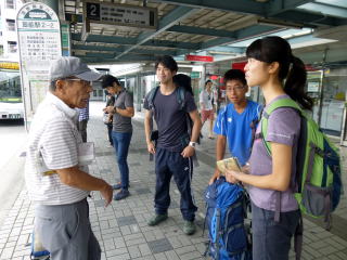 | 西部線 飯能駅に集結し、天覧山へのバスを待ちます。 | 下の公園で一息。天覧山頂まで軽い登りです。 | いつもは他のパーティで混みますが、今日は我々だけです。準備運動を行います。 |