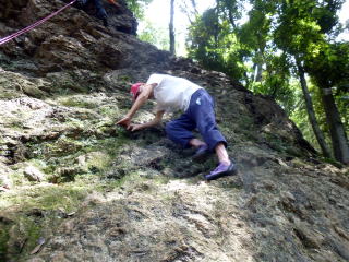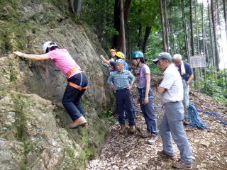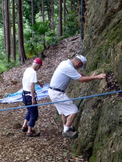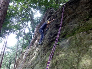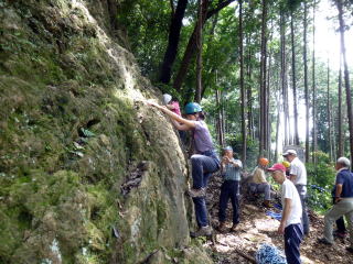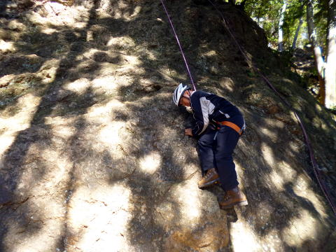 | 岩の名手、上田代表は岩の上で天狗のように動きます。まずは手本。動きが良すぎてあまり手本にはなりません。 | 今村さんが恐る恐る取り付きます。すっかり体を離してOKです。 | まずは初段 |