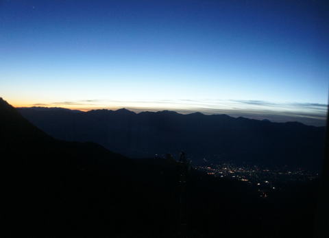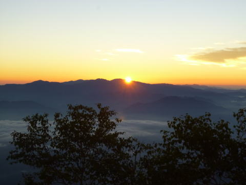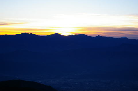 | 日本海に低気圧が通過したため、前夜は天気が悪化しましたが、夜半は回復し満天の星となりました。早朝部屋の窓から眺めると伊那の街の灯が瞬いていました。 | 南アルプスの北岳と間ノ岳の間に、朝日が昇って来ました。 |