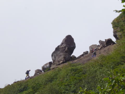 草滑りからトーミノ頭 草滑りはカルデラ壁の草付急斜にジグザグで刻まれ、横にはトーミノ頭の垂壁が見事だった。 |