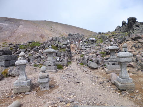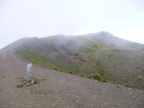 前掛山2527m 前掛山登頂(9:24)。規制緩和の限界点でありすぐ下山にかかった。計画ではJバンド分岐から外側外輪山を縦走することにしていたが、雲が懸かると予想し、湯の平高原方面へ変更した。 |