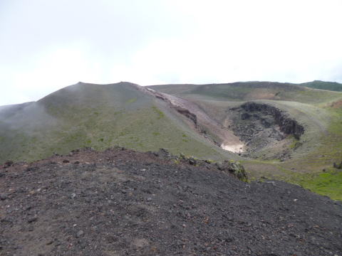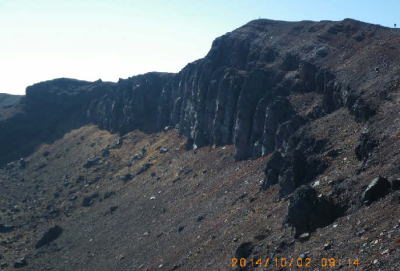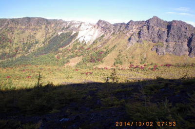 前掛山カルデラ壁 前掛山2527mは内側外輪山の最高地点で、浅間山の最高点2568mは画面左方にあって現在立ち入規制されている。 |
