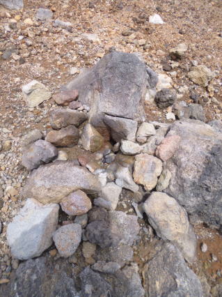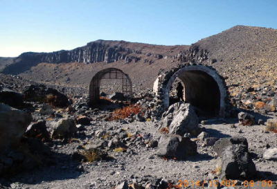 浅間山退避壕(前方前掛山) 内側外輪山の北端が高度を下げ内側火口原とつながった平地に2棟のシェルターが在った。御嶽噴火以来TVでよく放映される。右壕は外側の岩巻きが一部残り、左壕は鋼板のみになっていた。 |