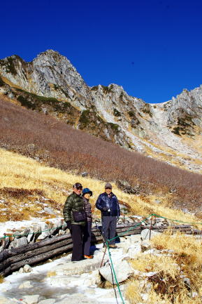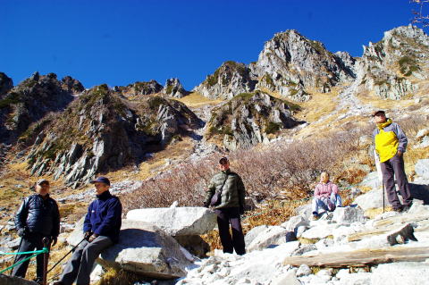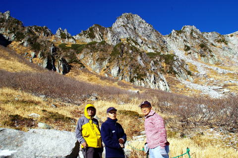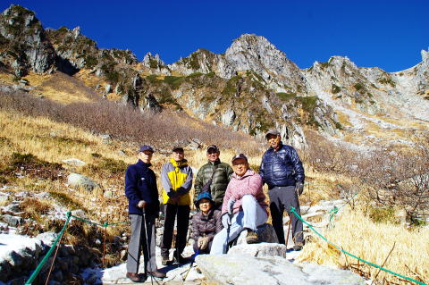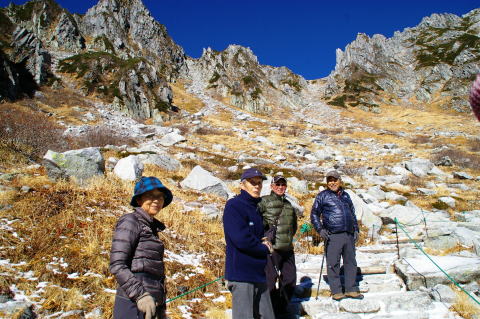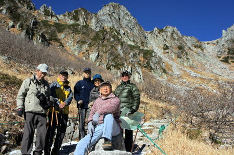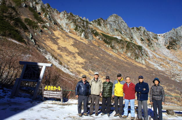 | カ−ルの底に池があります。甲斐駒の左に鋸が見えてきました。 | ホテルに戻りました。栗又、宮野、青木、恩田各OBです。 |