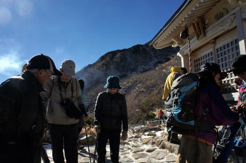 | 朝食後散策に出発します。 | 信州駒ヶ岳神社にお参りします。天照大神と大山祇大神を祀っています。 |